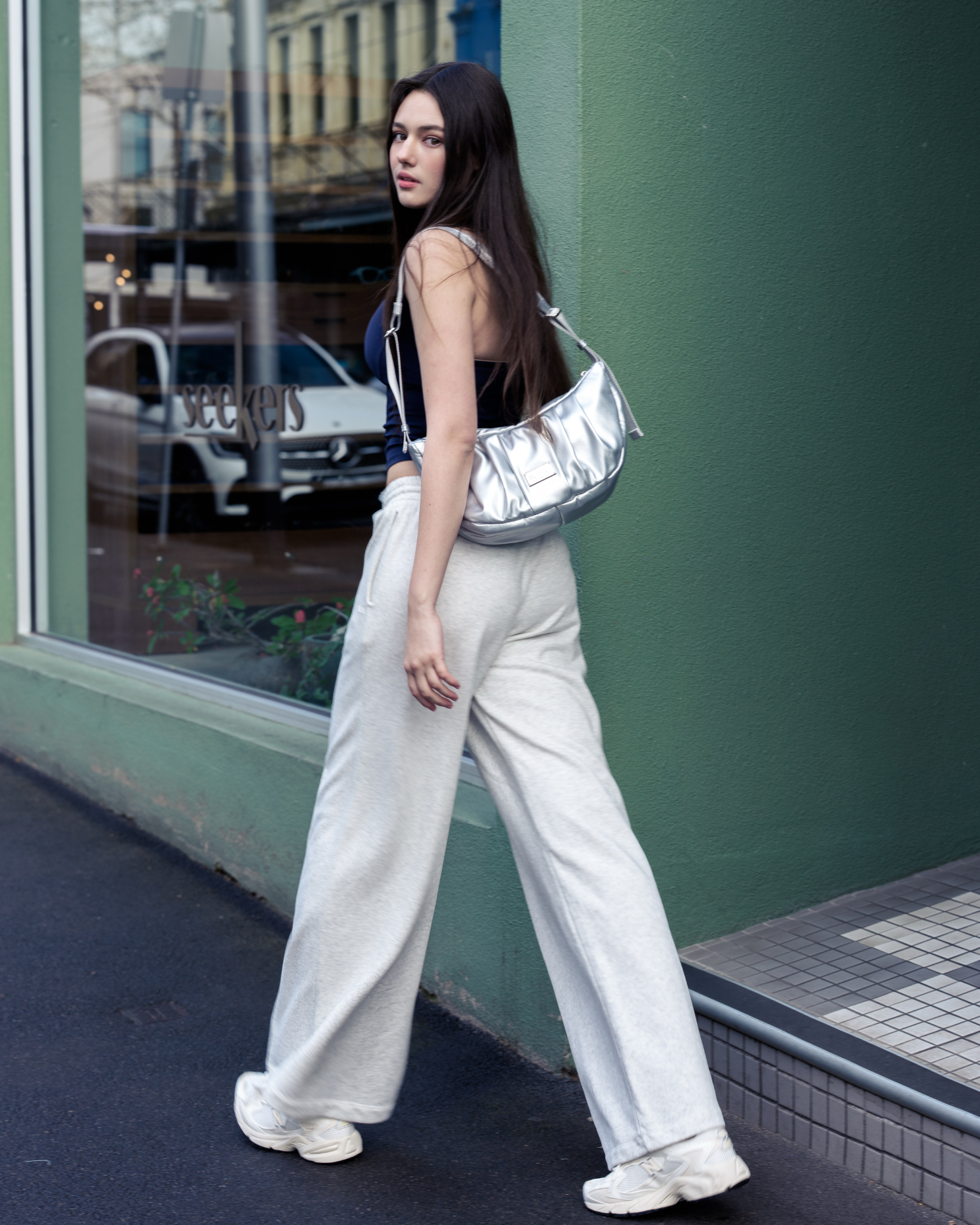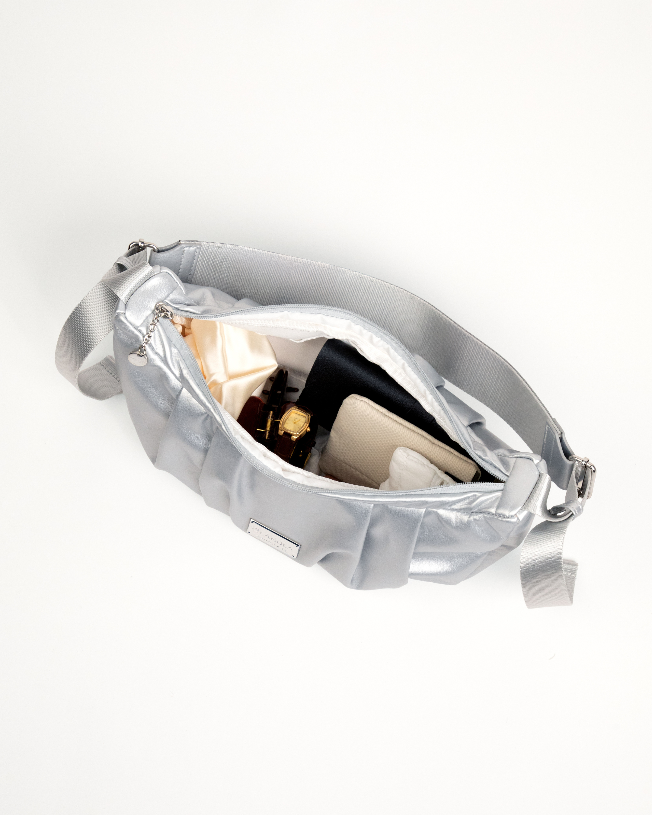 • Soft Metallic Fabric — Lightweight, water-repellent, and gently luminous with a subtle milk-silver tone.
