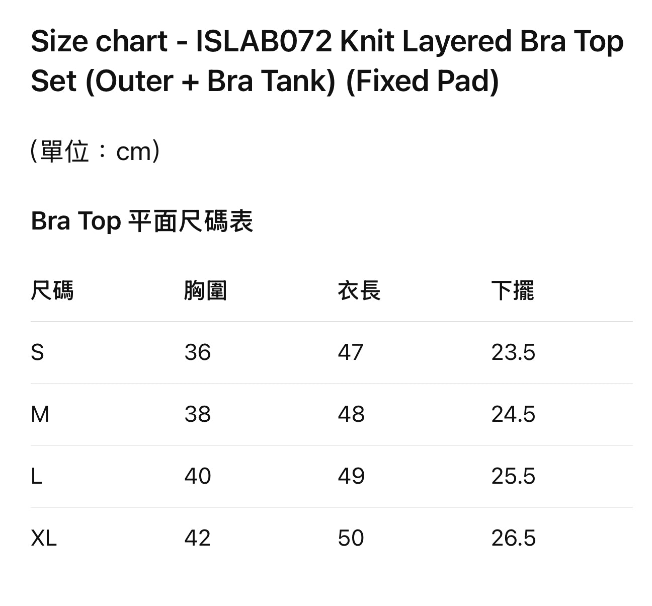 Size S:適合身高 150–165 cm,體重 40–50 kg 的顧客