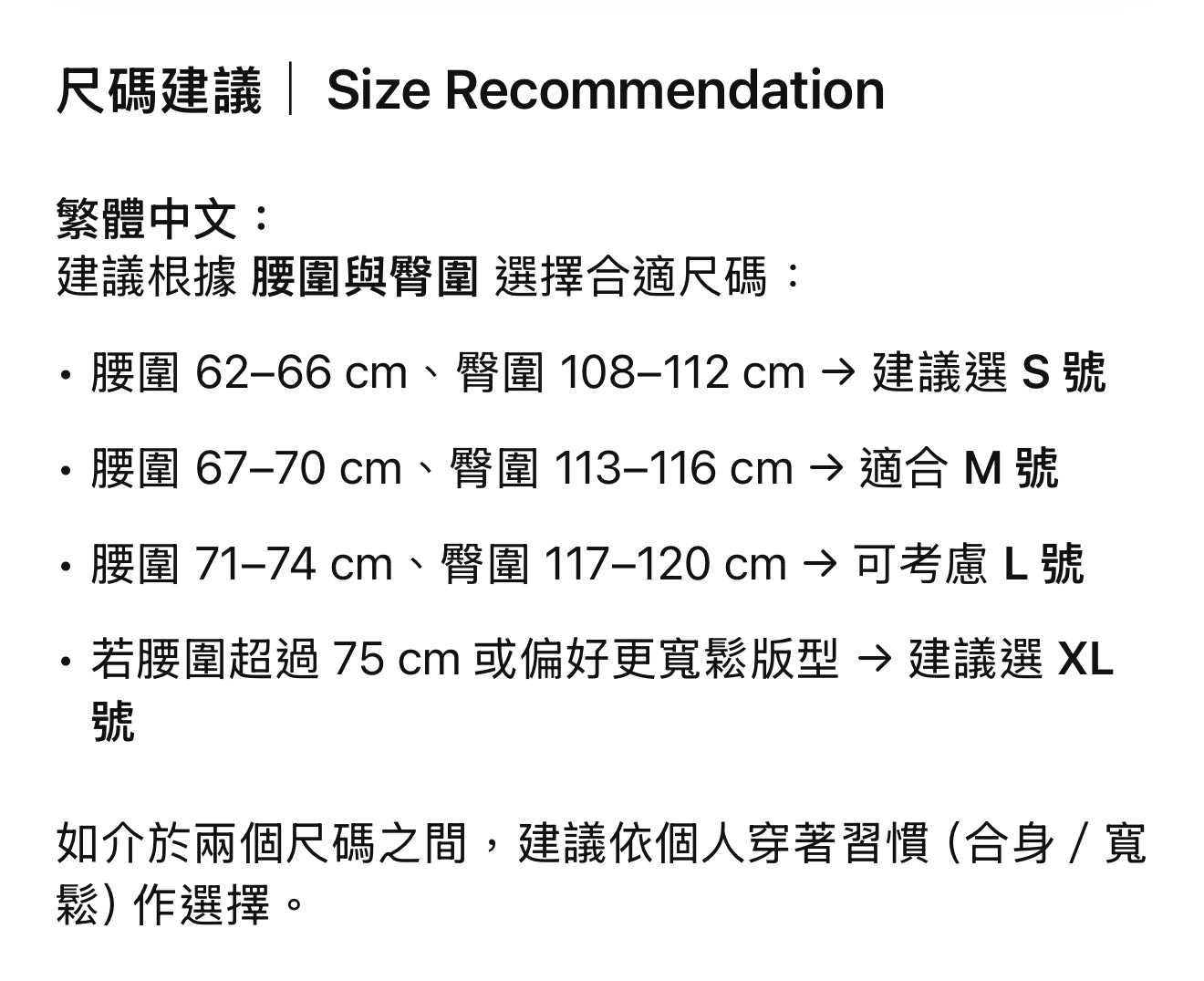 Size XL:適合身高 165 cm 以上、體重 65–75 kg 的顧客,或偏好寬鬆穿著感的人士選擇