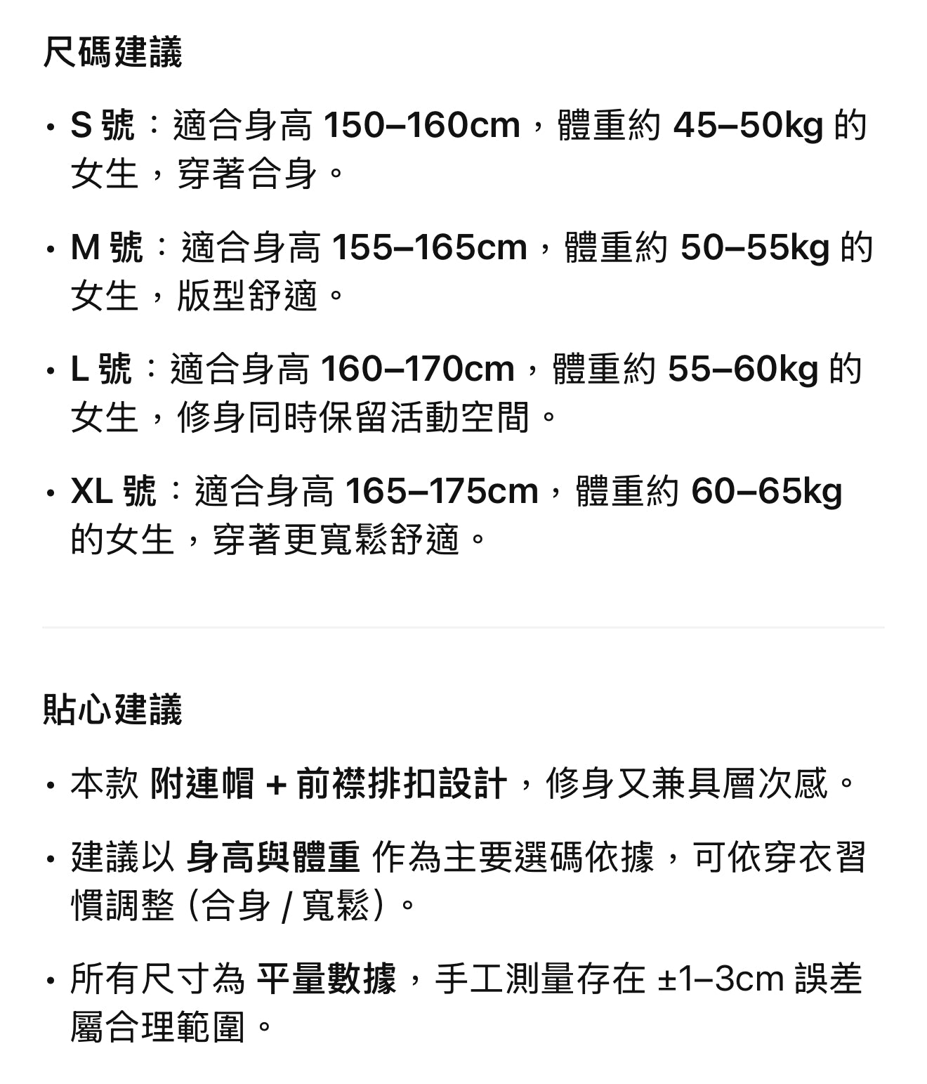 Size XL:適合身高 165 cm 以上、體重 65–75 kg 的顧客,或偏好寬鬆穿著感的人士選擇
