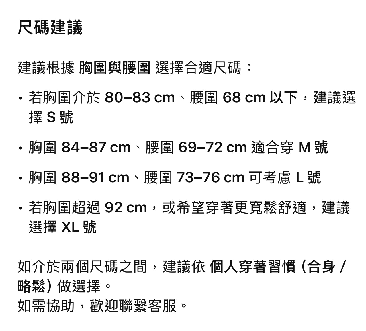 如有任何尺寸選擇上的疑問,歡迎聯絡客服,我們樂意協助您找到最適合的尺碼。